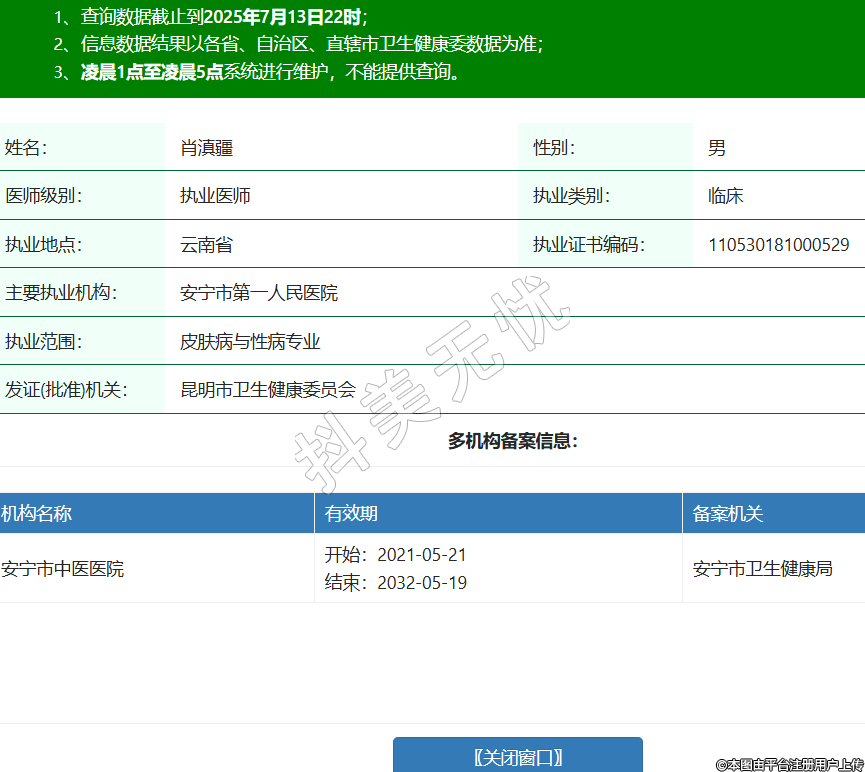 姓名:肖滇疆性別:男醫(yī)師級別:執(zhí)業(yè)醫(yī)師執(zhí)業(yè)類別:臨床執(zhí)業(yè)地點(diǎn):云南省執(zhí)業(yè)證書編碼:110530181000529主要執(zhí)業(yè)機(jī)構(gòu):安寧市第一人民醫(yī)院執(zhí)業(yè)范圍:皮膚病與性病專業(yè)發(fā)證(批準(zhǔn))機(jī)關(guān):昆明市衛(wèi)生健康委員會(huì)多機(jī)構(gòu)備案信息:機(jī)構(gòu)名稱 有效期 備案機(jī)關(guān) 安寧市中醫(yī)醫(yī)院 開始:2021-05-21結(jié)束:2032-05-19安寧市衛(wèi)生健康局 -