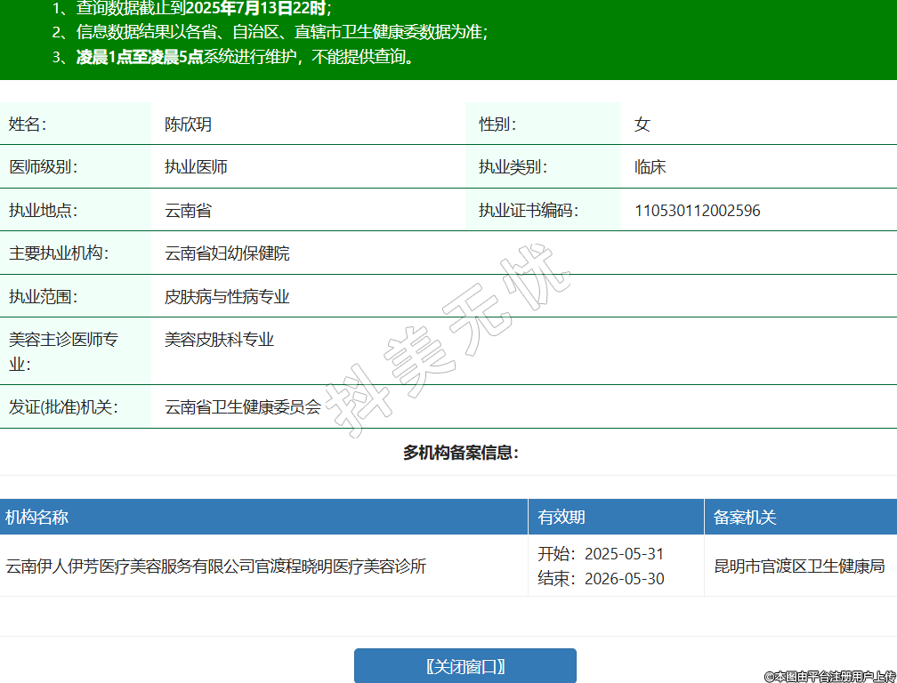 姓名:陳欣玥性別:女醫(yī)師級(jí)別:執(zhí)業(yè)醫(yī)師執(zhí)業(yè)類別:臨床執(zhí)業(yè)地點(diǎn):云南省執(zhí)業(yè)證書編碼:110530112002596主要執(zhí)業(yè)機(jī)構(gòu):云南省婦幼保健院執(zhí)業(yè)范圍:皮膚病與性病專業(yè)美容主診醫(yī)師專業(yè):美容皮膚科專業(yè)發(fā)證(批準(zhǔn))機(jī)關(guān):云南省衛(wèi)生健康委員會(huì)多機(jī)構(gòu)備案信息:機(jī)構(gòu)名稱 有效期 備案機(jī)關(guān) 云南伊人伊芳醫(yī)療美容服務(wù)有限公司官渡程曉明醫(yī)療美容診所 開始:2025-05-31結(jié)束:2026-05-30昆明市官渡區(qū)衛(wèi)生健康局 -