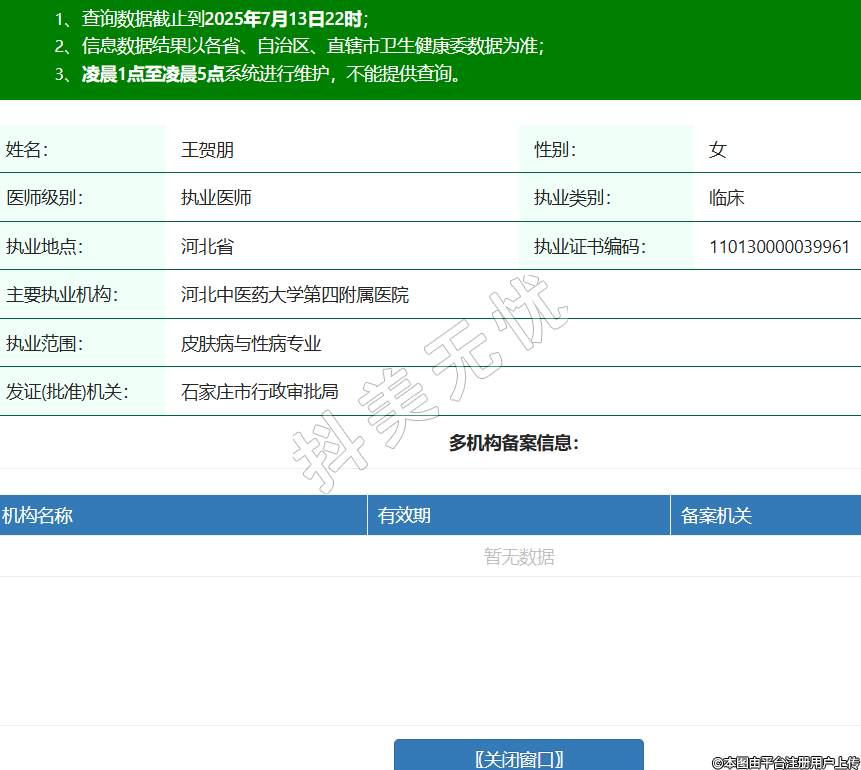 姓名:王賀朋性別:女醫(yī)師級別:執(zhí)業(yè)醫(yī)師執(zhí)業(yè)類別:臨床執(zhí)業(yè)地點:河北省執(zhí)業(yè)證書編碼:110130000039961主要執(zhí)業(yè)機構(gòu):河北中醫(yī)藥大學第四附屬醫(yī)院執(zhí)業(yè)范圍:皮膚病與性病專業(yè)發(fā)證(批準)機關(guān):石家莊市行政審批局