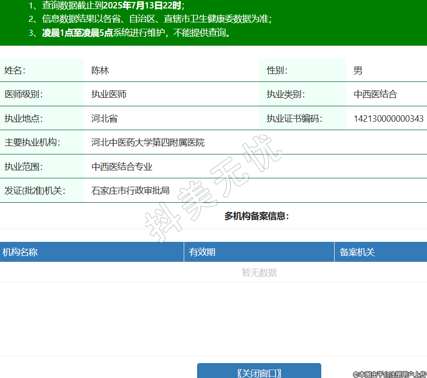姓名:陳林性別:男醫(yī)師級別:執(zhí)業(yè)醫(yī)師執(zhí)業(yè)類別:中西醫(yī)結(jié)合執(zhí)業(yè)地點:河北省執(zhí)業(yè)證書編碼:142130000000343主要執(zhí)業(yè)機構(gòu):河北中醫(yī)藥大學(xué)第四附屬醫(yī)院執(zhí)業(yè)范圍:中西醫(yī)結(jié)合專業(yè)發(fā)證(批準)機關(guān):石家莊市行政審批局 -