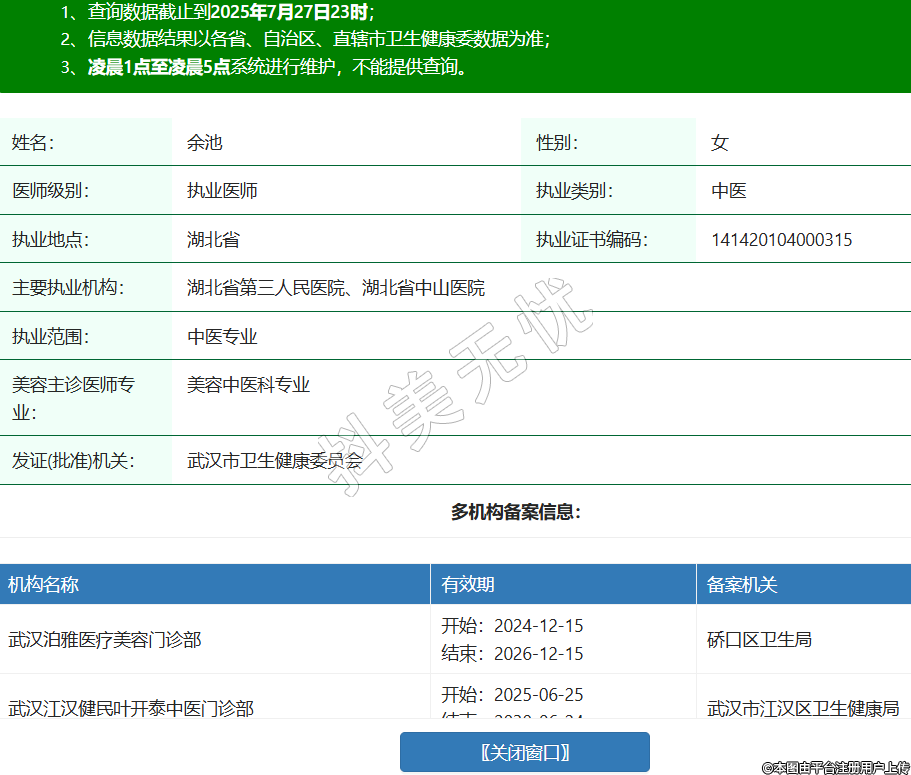 姓名:余池性別:女醫(yī)師級別:執(zhí)業(yè)醫(yī)師執(zhí)業(yè)類別:中醫(yī)執(zhí)業(yè)地點(diǎn):湖北省執(zhí)業(yè)證書編碼:141420104000315主要執(zhí)業(yè)機(jī)構(gòu):湖北省第三人民醫(yī)院、湖北省中山醫(yī)院執(zhí)業(yè)范圍:中醫(yī)專業(yè)美容主診醫(yī)師專業(yè):美容中醫(yī)科專業(yè)發(fā)證(批準(zhǔn))機(jī)關(guān):武漢市衛(wèi)生健康委員會(huì)多機(jī)構(gòu)備案信息:機(jī)構(gòu)名稱 有效期 備案機(jī)關(guān) 武漢泊雅醫(yī)療美容門診部 開始:2024-12-15結(jié)束:2026-12-15硚口區(qū)衛(wèi)生局 武漢江漢健民葉開泰中醫(yī)門診部 開始:2025-06-25結(jié)束:2030-06-24武漢市江漢區(qū)衛(wèi)生健康局 -