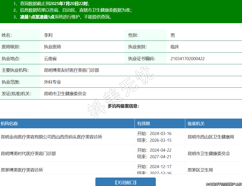 姓名:李利性別:男醫(yī)師級別:執(zhí)業(yè)醫(yī)師執(zhí)業(yè)類別:臨床執(zhí)業(yè)地點:云南省執(zhí)業(yè)證書編碼:210341702000422主要執(zhí)業(yè)機構:昆明博美友好醫(yī)療美容門診部執(zhí)業(yè)范圍:外科專業(yè)發(fā)證(批準)機關:昆明市衛(wèi)生健康委員會多機構備案信息:機構名稱 有效期 備案機關 昆明金尚醫(yī)療美容有限公司西山西貢碼頭醫(yī)療美容診所 開始:2024-03-16結束:2026-03-15昆明市西山區(qū)衛(wèi)生健康局 昆明博美時代醫(yī)療美容門診部 開始:2024-04-22結束:2027-04-21昆明市衛(wèi)生健康委員會 思茅博美醫(yī)療美容診所 開始:2024-12-17結束:2027-12-16思茅區(qū)衛(wèi)生局 -