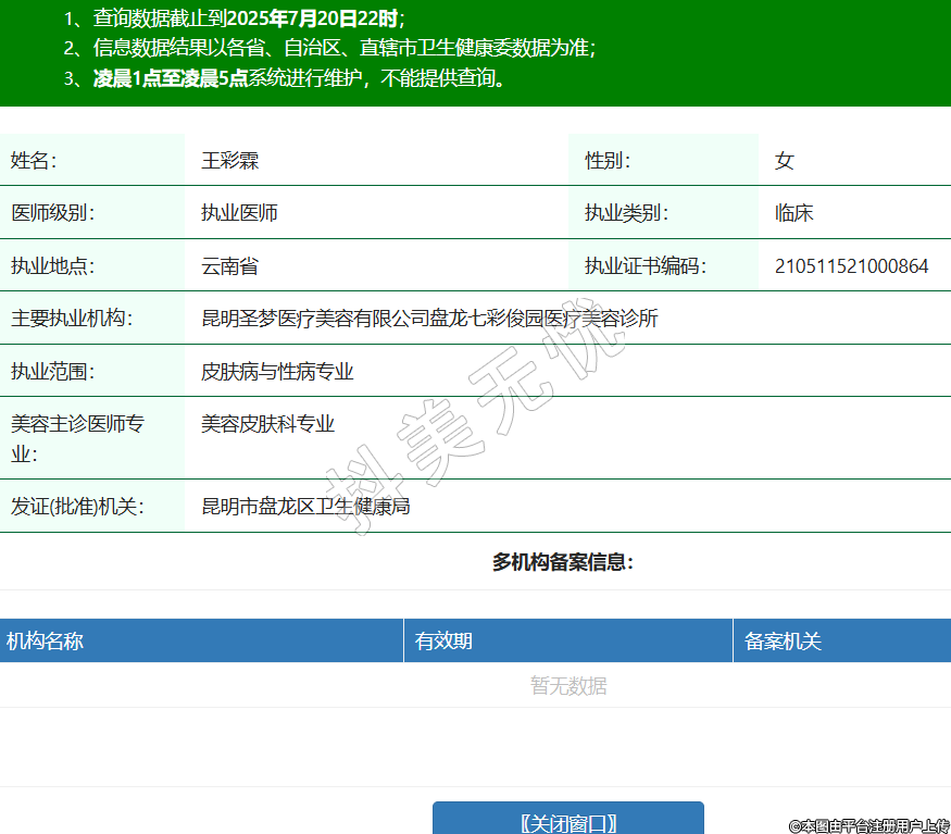姓名:王彩霖性別:女醫(yī)師級別:執(zhí)業(yè)醫(yī)師執(zhí)業(yè)類別:臨床執(zhí)業(yè)地點:云南省執(zhí)業(yè)證書編碼:210511521000864主要執(zhí)業(yè)機(jī)構(gòu):昆明圣夢醫(yī)療美容有限公司盤龍七彩俊園醫(yī)療美容診所執(zhí)業(yè)范圍:皮膚病與性病專業(yè)美容主診醫(yī)師專業(yè):美容皮膚科專業(yè)發(fā)證(批準(zhǔn))機(jī)關(guān):昆明市盤龍區(qū)衛(wèi)生健康局 -