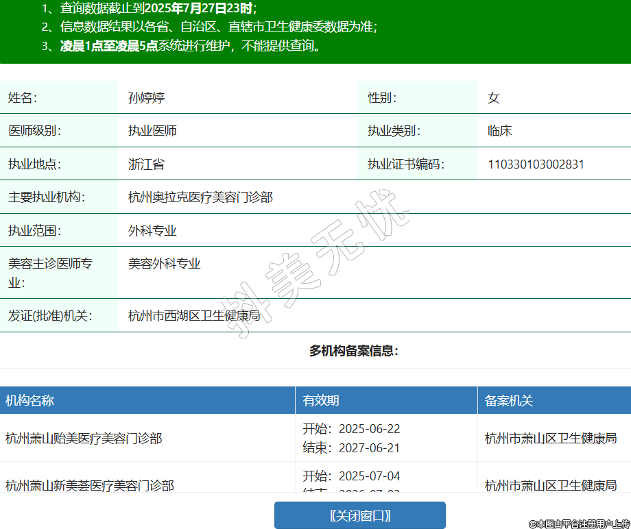 姓名:孫婷婷性別:女醫(yī)師級(jí)別:執(zhí)業(yè)醫(yī)師執(zhí)業(yè)類別:臨床執(zhí)業(yè)地點(diǎn):浙江省執(zhí)業(yè)證書編碼:110330103002831主要執(zhí)業(yè)機(jī)構(gòu):杭州奧拉克醫(yī)療美容門診部執(zhí)業(yè)范圍:外科專業(yè)美容主診醫(yī)師專業(yè):美容外科專業(yè)發(fā)證(批準(zhǔn))機(jī)關(guān):杭州市西湖區(qū)衛(wèi)生健康局多機(jī)構(gòu)備案信息:機(jī)構(gòu)名稱 有效期 備案機(jī)關(guān) 杭州蕭山貽美醫(yī)療美容門診部 開(kāi)始:2025-06-22結(jié)束:2027-06-21杭州市蕭山區(qū)衛(wèi)生健康局 杭州蕭山新美薈醫(yī)療美容門診部 開(kāi)始:2025-07-04結(jié)束:2026-07-03杭州市蕭山區(qū)衛(wèi)生健康局 -