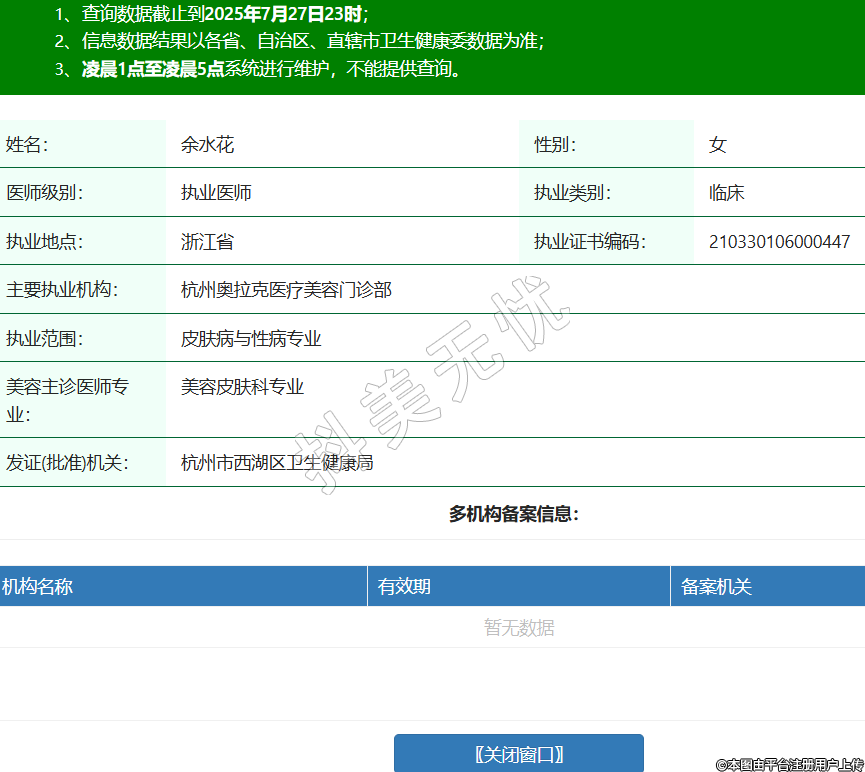 姓名:余水花性別:女醫(yī)師級別:執(zhí)業(yè)醫(yī)師執(zhí)業(yè)類別:臨床執(zhí)業(yè)地點:浙江省執(zhí)業(yè)證書編碼:210330106000447主要執(zhí)業(yè)機構(gòu):杭州奧拉克醫(yī)療美容門診部執(zhí)業(yè)范圍:皮膚病與性病專業(yè)美容主診醫(yī)師專業(yè):美容皮膚科專業(yè)發(fā)證(批準)機關(guān):杭州市西湖區(qū)衛(wèi)生健康局 -