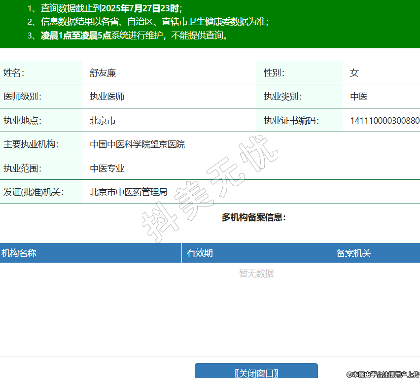 姓名:舒友廉性別:女醫(yī)師級(jí)別:執(zhí)業(yè)醫(yī)師執(zhí)業(yè)類(lèi)別:中醫(yī)執(zhí)業(yè)地點(diǎn):北京市執(zhí)業(yè)證書(shū)編碼:141110000300880主要執(zhí)業(yè)機(jī)構(gòu):中國(guó)中醫(yī)科學(xué)院望京醫(yī)院執(zhí)業(yè)范圍:中醫(yī)專(zhuān)業(yè)發(fā)證(批準(zhǔn))機(jī)關(guān):北京市中醫(yī)藥管理局 -