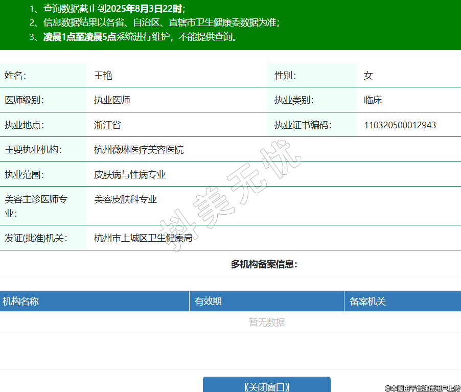 姓名:王艷性別:女醫(yī)師級別:執(zhí)業(yè)醫(yī)師執(zhí)業(yè)類別:臨床執(zhí)業(yè)地點:浙江省執(zhí)業(yè)證書編碼:110320500012943主要執(zhí)業(yè)機構:杭州薇琳醫(yī)療美容醫(yī)院執(zhí)業(yè)范圍:皮膚病與性病專業(yè)美容主診醫(yī)師專業(yè):美容皮膚科專業(yè)發(fā)證(批準)機關:杭州市上城區(qū)衛(wèi)生健康局 -