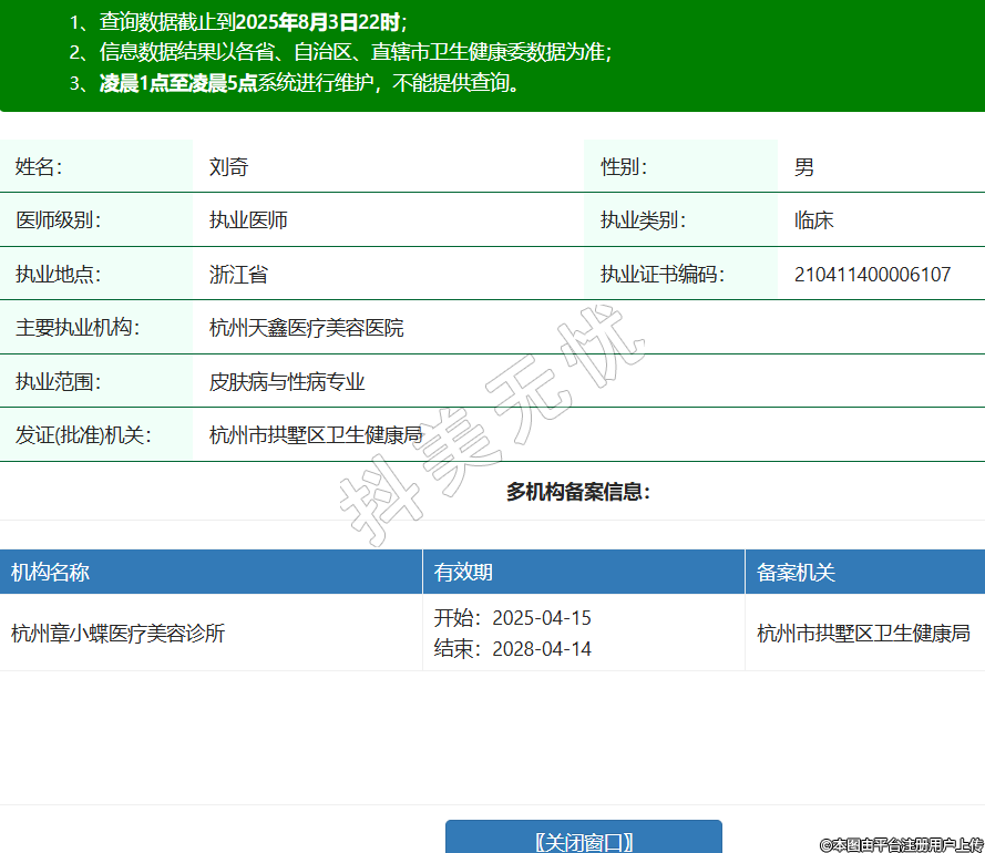 姓名:劉奇性別:男醫(yī)師級(jí)別:執(zhí)業(yè)醫(yī)師執(zhí)業(yè)類別:臨床執(zhí)業(yè)地點(diǎn):浙江省執(zhí)業(yè)證書編碼:210411400006107主要執(zhí)業(yè)機(jī)構(gòu):杭州天鑫醫(yī)療美容醫(yī)院執(zhí)業(yè)范圍:皮膚病與性病專業(yè)發(fā)證(批準(zhǔn))機(jī)關(guān):杭州市拱墅區(qū)衛(wèi)生健康局多機(jī)構(gòu)備案信息:機(jī)構(gòu)名稱 有效期 備案機(jī)關(guān) 杭州章小蝶醫(yī)療美容診所 開始:2025-04-15結(jié)束:2028-04-14杭州市拱墅區(qū)衛(wèi)生健康局 -