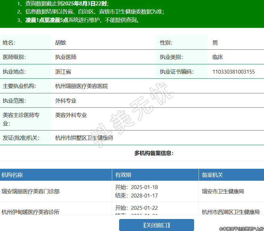 姓名:胡敏性別:男醫(yī)師級別:執(zhí)業(yè)醫(yī)師執(zhí)業(yè)類別:臨床執(zhí)業(yè)地點(diǎn):浙江省執(zhí)業(yè)證書編碼:110330381003155主要執(zhí)業(yè)機(jī)構(gòu):杭州瑞麗醫(yī)療美容醫(yī)院執(zhí)業(yè)范圍:外科專業(yè)美容主診醫(yī)師專業(yè):美容外科專業(yè)發(fā)證(批準(zhǔn))機(jī)關(guān):杭州市拱墅區(qū)衛(wèi)生健康局多機(jī)構(gòu)備案信息:機(jī)構(gòu)名稱 有效期 備案機(jī)關(guān) 瑞安瑞麗醫(yī)療美容門診部 開始:2025-01-18結(jié)束:2028-01-17瑞安市衛(wèi)生健康局 杭州伊甸媛醫(yī)療美容診所 開始:2025-01-22結(jié)束:2026-01-21杭州市西湖區(qū)衛(wèi)生健康局 -