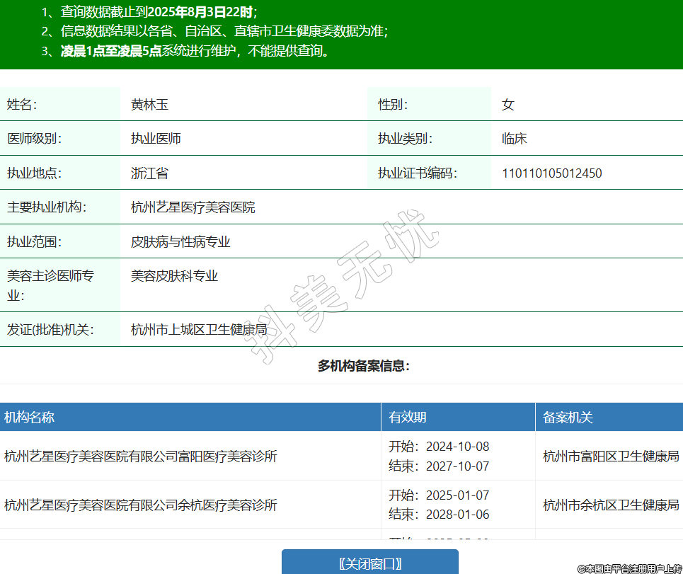 姓名:黃林玉性別:女醫(yī)師級別:執(zhí)業(yè)醫(yī)師執(zhí)業(yè)類別:臨床執(zhí)業(yè)地點:浙江省執(zhí)業(yè)證書編碼:110110105012450主要執(zhí)業(yè)機構:杭州藝星醫(yī)療美容醫(yī)院執(zhí)業(yè)范圍:皮膚病與性病專業(yè)美容主診醫(yī)師專業(yè):美容皮膚科專業(yè)發(fā)證(批準)機關:杭州市上城區(qū)衛(wèi)生健康局多機構備案信息:機構名稱 有效期 備案機關 杭州藝星醫(yī)療美容醫(yī)院有限公司富陽醫(yī)療美容診所 開始:2024-10-08結束:2027-10-07杭州市富陽區(qū)衛(wèi)生健康局 杭州藝星醫(yī)療美容醫(yī)院有限公司余杭醫(yī)療美容診所 開始:2025-01-07結束:2028-01-06杭州市余杭區(qū)衛(wèi)生健康局 杭州藝星醫(yī)療美容醫(yī)院有限公司城北醫(yī)療美容診所 開始:2025-05-08結束:2028-05-07杭州市拱墅區(qū)衛(wèi)生健康局 杭州藝星醫(yī)療美容醫(yī)院有限公司城東醫(yī)療美容診所 開始:2025-07-24結束:2028-07-23杭州市上城區(qū)衛(wèi)生健康局 -