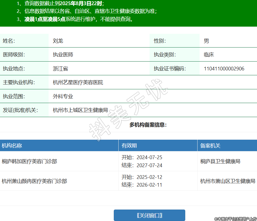 姓名:劉龍性別:男醫(yī)師級別:執(zhí)業(yè)醫(yī)師執(zhí)業(yè)類別:臨床執(zhí)業(yè)地點(diǎn):浙江省執(zhí)業(yè)證書編碼:110411000002906主要執(zhí)業(yè)機(jī)構(gòu):杭州藝星醫(yī)療美容醫(yī)院執(zhí)業(yè)范圍:外科專業(yè)發(fā)證(批準(zhǔn))機(jī)關(guān):杭州市上城區(qū)衛(wèi)生健康局多機(jī)構(gòu)備案信息:機(jī)構(gòu)名稱 有效期 備案機(jī)關(guān) 桐廬韓加醫(yī)療美容門診部 開始:2024-07-25結(jié)束:2027-07-24桐廬縣衛(wèi)生健康局 杭州蕭山顏冉醫(yī)療美容門診部 開始:2025-02-12結(jié)束:2026-02-11杭州市蕭山區(qū)衛(wèi)生健康局 -