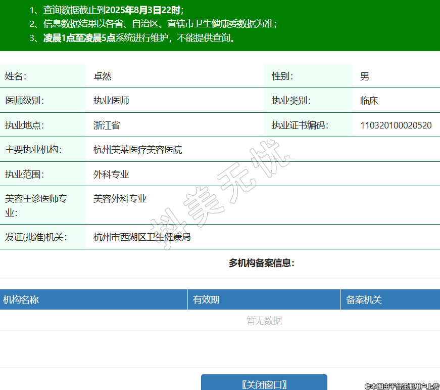 姓名:卓然性別:男醫(yī)師級別:執(zhí)業(yè)醫(yī)師執(zhí)業(yè)類別:臨床執(zhí)業(yè)地點:浙江省執(zhí)業(yè)證書編碼:110320100020520主要執(zhí)業(yè)機構(gòu):杭州美萊醫(yī)療美容醫(yī)院執(zhí)業(yè)范圍:外科專業(yè)美容主診醫(yī)師專業(yè):美容外科專業(yè)發(fā)證(批準(zhǔn))機關(guān):杭州市西湖區(qū)衛(wèi)生健康局 -