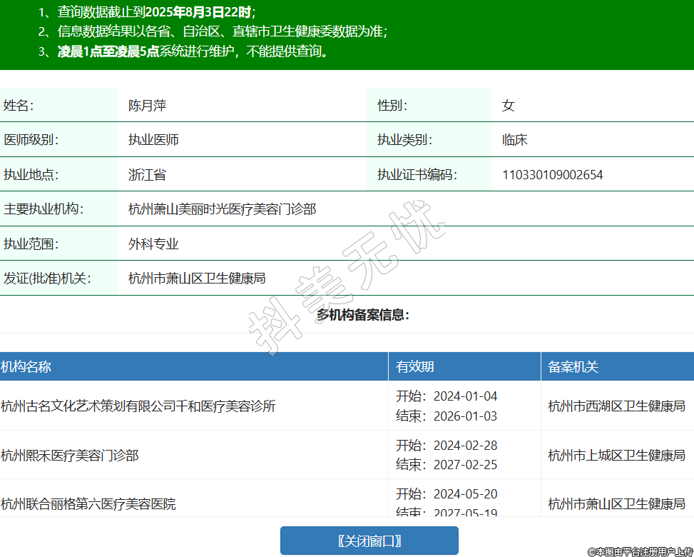 姓名:陳月萍性別:女醫(yī)師級(jí)別:執(zhí)業(yè)醫(yī)師執(zhí)業(yè)類別:臨床執(zhí)業(yè)地點(diǎn):浙江省執(zhí)業(yè)證書(shū)編碼:110330109002654主要執(zhí)業(yè)機(jī)構(gòu):杭州蕭山美麗時(shí)光醫(yī)療美容門診部執(zhí)業(yè)范圍:外科專業(yè)發(fā)證(批準(zhǔn))機(jī)關(guān):杭州市蕭山區(qū)衛(wèi)生健康局多機(jī)構(gòu)備案信息:機(jī)構(gòu)名稱 有效期 備案機(jī)關(guān) 杭州古名文化藝術(shù)策劃有限公司千和醫(yī)療美容診所 開(kāi)始:2024-01-04結(jié)束:2026-01-03杭州市西湖區(qū)衛(wèi)生健康局 杭州熙禾醫(yī)療美容門診部 開(kāi)始:2024-02-28結(jié)束:2027-02-25杭州市上城區(qū)衛(wèi)生健康局 杭州聯(lián)合麗格第六醫(yī)療美容醫(yī)院 開(kāi)始:2024-05-20結(jié)束:2027-05-19杭州市蕭山區(qū)衛(wèi)生健康局 杭州仁術(shù)醫(yī)療管理有限公司臨平秀浦街醫(yī)療美容診所 開(kāi)始:2024-09-03結(jié)束:2027-09-01杭州市臨平區(qū)衛(wèi)生健康局 杭州潔銘威塑醫(yī)療美容醫(yī)院 開(kāi)始:2025-01-10結(jié)束:2026-01-09杭州市拱墅區(qū)衛(wèi)生健康局 寧波鄞州亮騰醫(yī)療美容診所 開(kāi)始:2025-03-18結(jié)束:2026-03-13寧波市鄞州區(qū)衛(wèi)生健康局 杭州熙柚醫(yī)療美容門診部 開(kāi)始:2025-06-04結(jié)束:2028-06-03杭州市上城區(qū)衛(wèi)生健康局 金華金東本真醫(yī)療美容門診部 開(kāi)始:2025-07-08結(jié)束:2027-07-07金華市金東區(qū)衛(wèi)生健康局 -