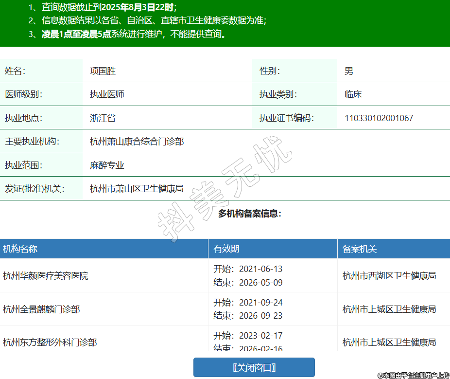 姓名:項國勝性別:男醫(yī)師級別:執(zhí)業(yè)醫(yī)師執(zhí)業(yè)類別:臨床執(zhí)業(yè)地點:浙江省執(zhí)業(yè)證書編碼:110330102001067主要執(zhí)業(yè)機構(gòu):杭州蕭山康合綜合門診部執(zhí)業(yè)范圍:麻醉專業(yè)發(fā)證(批準)機關:杭州市蕭山區(qū)衛(wèi)生健康局多機構(gòu)備案信息:機構(gòu)名稱 有效期 備案機關 杭州華顏醫(yī)療美容醫(yī)院 開始:2021-06-13結(jié)束:2026-05-09杭州市西湖區(qū)衛(wèi)生健康局 杭州全景麒麟門診部 開始:2021-09-24結(jié)束:2026-09-23杭州市上城區(qū)衛(wèi)生健康局 杭州東方整形外科門診部 開始:2023-02-17結(jié)束:2026-02-16杭州市上城區(qū)衛(wèi)生健康局 杭州蕭山碩人醫(yī)療美容門診部 開始:2023-03-15結(jié)束:2026-03-14杭州市蕭山區(qū)衛(wèi)生健康局 杭州清沐醫(yī)療美容門診部 開始:2023-06-08結(jié)束:2026-06-07杭州市濱江區(qū)衛(wèi)生健康局 杭州美佳美醫(yī)療門診部 開始:2023-07-05結(jié)束:2026-07-04杭州市拱墅區(qū)衛(wèi)生健康局 杭州格萊美醫(yī)療美容醫(yī)院 開始:2023-07-15結(jié)束:2026-07-14杭州市拱墅區(qū)衛(wèi)生健康局 杭州赫蘭氏醫(yī)療美容醫(yī)院 開始:2023-08-29結(jié)束:2026-08-28杭州市拱墅區(qū)衛(wèi)生健康局 杭州星秘醫(yī)療美容門診部 開始:2024-01-24結(jié)束:2027-01-23杭州市拱墅區(qū)衛(wèi)生健康局 杭州蕭山儷悅醫(yī)療美容門診部 開始:2024-02-28結(jié)束:2027-02-27杭州市蕭山區(qū)衛(wèi)生健康局 杭州蕭山奧蘭醫(yī)療美容門診部 開始:2024-03-12結(jié)束:2027-03-11杭州市蕭山區(qū)衛(wèi)生健康局 杭州虎山林畔醫(yī)療美容門診部 開始:2024-06-15結(jié)束:2027-06-14杭州市拱墅區(qū)衛(wèi)生健康局 杭州顏鑒醫(yī)療美容門診部 開始:2024-07-02結(jié)束:2027-07-01杭州市拱墅區(qū)衛(wèi)生健康局 杭州蕭山盛薈銘源綜合門診部 開始:2024-07-28結(jié)束:2027-07-27杭州市蕭山區(qū)衛(wèi)生健康局 杭州瑞秀綜合門診部 開始:2024-08-20結(jié)束:2027-08-19杭州市拱墅區(qū)衛(wèi)生健康局 杭州熙禾醫(yī)療美容門診部 開始:2024-08-26結(jié)束:2027-08-25杭州市上城區(qū)衛(wèi)生健康局 杭州潔銘威塑醫(yī)療美容醫(yī)院 開始:2025-01-10結(jié)束:2026-01-09杭州市拱墅區(qū)衛(wèi)生健康局 杭州清鍇醫(yī)療美容門診部 開始:2025-02-18結(jié)束:2027-02-17杭州市上城區(qū)衛(wèi)生健康局 杭州西興星圣婭醫(yī)療美容門診部 開始:2025-03-22結(jié)束:2026-03-21杭州市濱江區(qū)衛(wèi)生健康局 杭州瑞智醫(yī)療美容門診部 開始:2025-05-22結(jié)束:2027-04-30杭州市上城區(qū)衛(wèi)生健康局 杭州熙柚醫(yī)療美容門診部 開始:2025-06-04結(jié)束:2028-06-03杭州市上城區(qū)衛(wèi)生健康局 杭州靜港醫(yī)療美容診所 開始:2025-06-10結(jié)束:2028-06-09杭州市拱墅區(qū)衛(wèi)生健康局 杭州潮牌美肌綜合門診部 開始:2025-06-19結(jié)束:2026-06-18杭州市拱墅區(qū)衛(wèi)生健康局 -