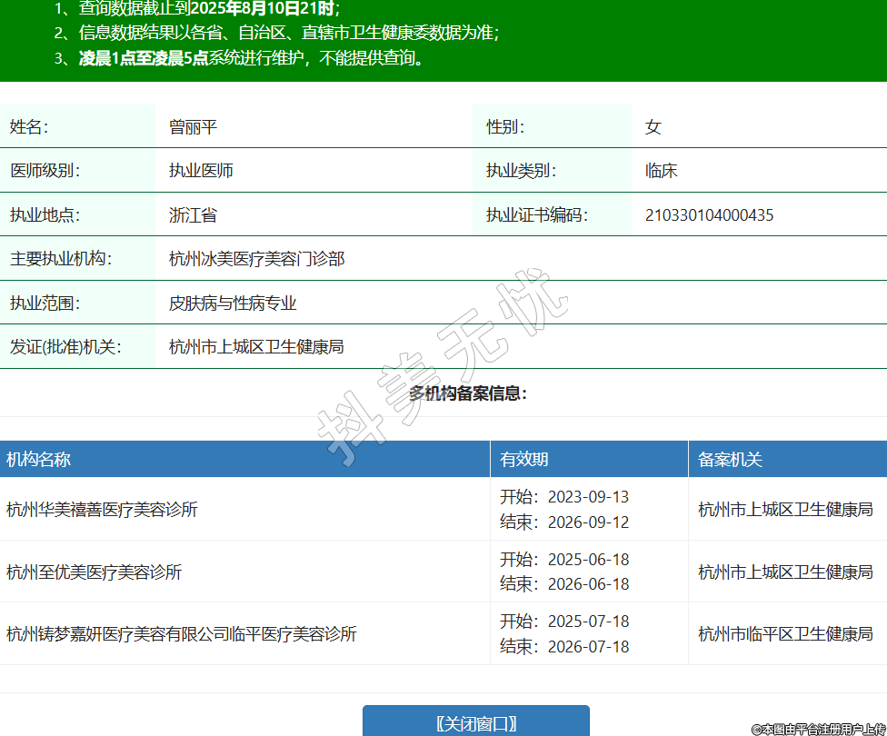 姓名:曾麗平性別:女醫(yī)師級(jí)別:執(zhí)業(yè)醫(yī)師執(zhí)業(yè)類別:臨床執(zhí)業(yè)地點(diǎn):浙江省執(zhí)業(yè)證書編碼:210330104000435主要執(zhí)業(yè)機(jī)構(gòu):杭州冰美醫(yī)療美容門診部執(zhí)業(yè)范圍:皮膚病與性病專業(yè)發(fā)證(批準(zhǔn))機(jī)關(guān):杭州市上城區(qū)衛(wèi)生健康局多機(jī)構(gòu)備案信息:機(jī)構(gòu)名稱 有效期 備案機(jī)關(guān) 杭州華美禧善醫(yī)療美容診所 開始:2023-09-13結(jié)束:2026-09-12杭州市上城區(qū)衛(wèi)生健康局 杭州至優(yōu)美醫(yī)療美容診所 開始:2025-06-18結(jié)束:2026-06-18杭州市上城區(qū)衛(wèi)生健康局 杭州鑄夢(mèng)嘉妍醫(yī)療美容有限公司臨平醫(yī)療美容診所 開始:2025-07-18結(jié)束:2026-07-18杭州市臨平區(qū)衛(wèi)生健康局 -