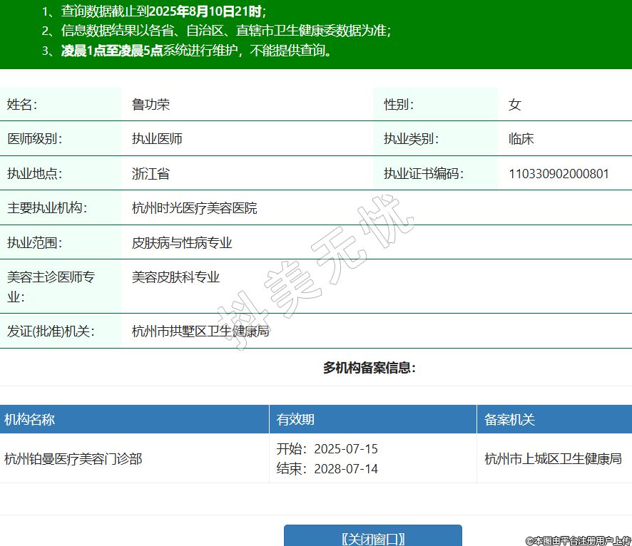 姓名:魯功榮性別:女醫(yī)師級(jí)別:執(zhí)業(yè)醫(yī)師執(zhí)業(yè)類別:臨床執(zhí)業(yè)地點(diǎn):浙江省執(zhí)業(yè)證書(shū)編碼:110330902000801主要執(zhí)業(yè)機(jī)構(gòu):杭州時(shí)光醫(yī)療美容醫(yī)院執(zhí)業(yè)范圍:皮膚病與性病專業(yè)美容主診醫(yī)師專業(yè):美容皮膚科專業(yè)發(fā)證(批準(zhǔn))機(jī)關(guān):杭州市拱墅區(qū)衛(wèi)生健康局多機(jī)構(gòu)備案信息:機(jī)構(gòu)名稱 有效期 備案機(jī)關(guān) 杭州鉑曼醫(yī)療美容門診部 開(kāi)始:2025-07-15結(jié)束:2028-07-14杭州市上城區(qū)衛(wèi)生健康局 -