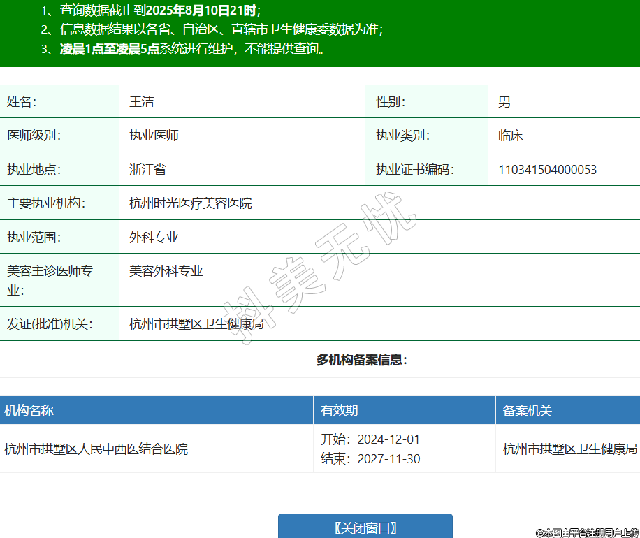 姓名:王潔性別:男醫(yī)師級別:執(zhí)業(yè)醫(yī)師執(zhí)業(yè)類別:臨床執(zhí)業(yè)地點:浙江省執(zhí)業(yè)證書編碼:110341504000053主要執(zhí)業(yè)機構(gòu):杭州時光醫(yī)療美容醫(yī)院執(zhí)業(yè)范圍:外科專業(yè)美容主診醫(yī)師專業(yè):美容外科專業(yè)發(fā)證(批準)機關(guān):杭州市拱墅區(qū)衛(wèi)生健康局多機構(gòu)備案信息:機構(gòu)名稱 有效期 備案機關(guān) 杭州市拱墅區(qū)人民中西醫(yī)結(jié)合醫(yī)院 開始:2024-12-01結(jié)束:2027-11-30杭州市拱墅區(qū)衛(wèi)生健康局 -