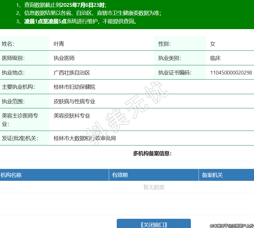 姓名:葉青性別:女醫(yī)師級別:執(zhí)業(yè)醫(yī)師執(zhí)業(yè)類別:臨床執(zhí)業(yè)地點(diǎn):廣西壯族自治區(qū)執(zhí)業(yè)證書編碼:110450000020298主要執(zhí)業(yè)機(jī)構(gòu):桂林市婦幼保健院執(zhí)業(yè)范圍:皮膚病與性病專業(yè)美容主診醫(yī)師專業(yè):美容皮膚科專業(yè)發(fā)證(批準(zhǔn))機(jī)關(guān):桂林市大數(shù)據(jù)和行政審批局 -