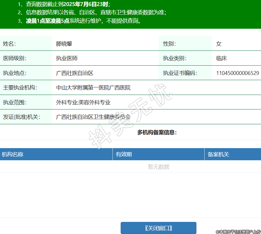 姓名:滕曉顰性別:女醫(yī)師級別:執(zhí)業(yè)醫(yī)師執(zhí)業(yè)類別:臨床執(zhí)業(yè)地點:廣西壯族自治區(qū)執(zhí)業(yè)證書編碼:110450000006529主要執(zhí)業(yè)機構:中山大學附屬第一醫(yī)院廣西醫(yī)院執(zhí)業(yè)范圍:外科專業(yè);美容外科專業(yè)發(fā)證(批準)機關:廣西壯族自治區(qū)衛(wèi)生健康委員會 -