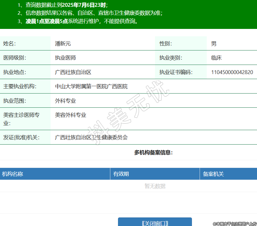 姓名:潘新元性別:男醫(yī)師級(jí)別:執(zhí)業(yè)醫(yī)師執(zhí)業(yè)類別:臨床執(zhí)業(yè)地點(diǎn):廣西壯族自治區(qū)執(zhí)業(yè)證書(shū)編碼:110450000042820主要執(zhí)業(yè)機(jī)構(gòu):中山大學(xué)附屬第一醫(yī)院廣西醫(yī)院執(zhí)業(yè)范圍:外科專業(yè)美容主診醫(yī)師專業(yè):美容外科專業(yè)發(fā)證(批準(zhǔn))機(jī)關(guān):廣西壯族自治區(qū)衛(wèi)生健康委員會(huì) -