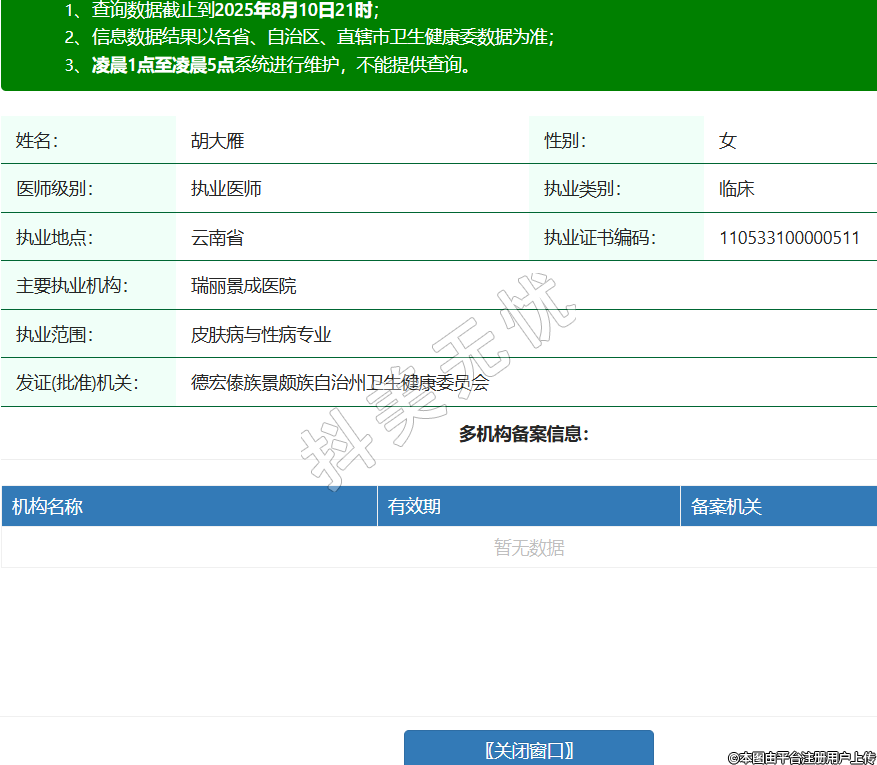 姓名:胡大雁性別:女醫(yī)師級別:執(zhí)業(yè)醫(yī)師執(zhí)業(yè)類別:臨床執(zhí)業(yè)地點:云南省執(zhí)業(yè)證書編碼:110533100000511主要執(zhí)業(yè)機(jī)構(gòu):瑞麗景成醫(yī)院執(zhí)業(yè)范圍:皮膚病與性病專業(yè)發(fā)證(批準(zhǔn))機(jī)關(guān):德宏傣族景頗族自治州衛(wèi)生健康委員會