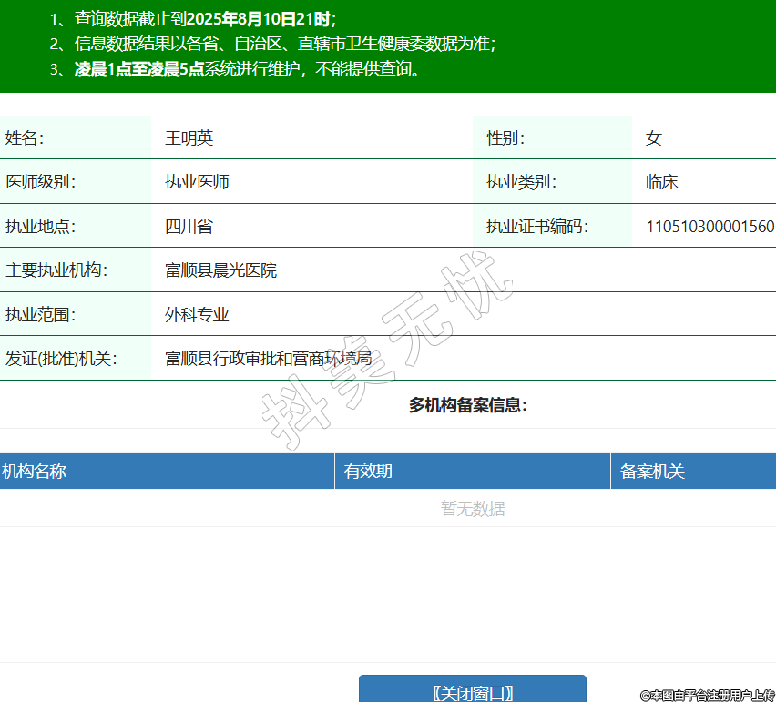 姓名:王明英性別:女醫(yī)師級別:執(zhí)業(yè)醫(yī)師執(zhí)業(yè)類別:臨床執(zhí)業(yè)地點:四川省執(zhí)業(yè)證書編碼:110510300001560主要執(zhí)業(yè)機構(gòu):富順縣晨光醫(yī)院執(zhí)業(yè)范圍:外科專業(yè)發(fā)證(批準(zhǔn))機關(guān):富順縣行政審批和營商環(huán)境局