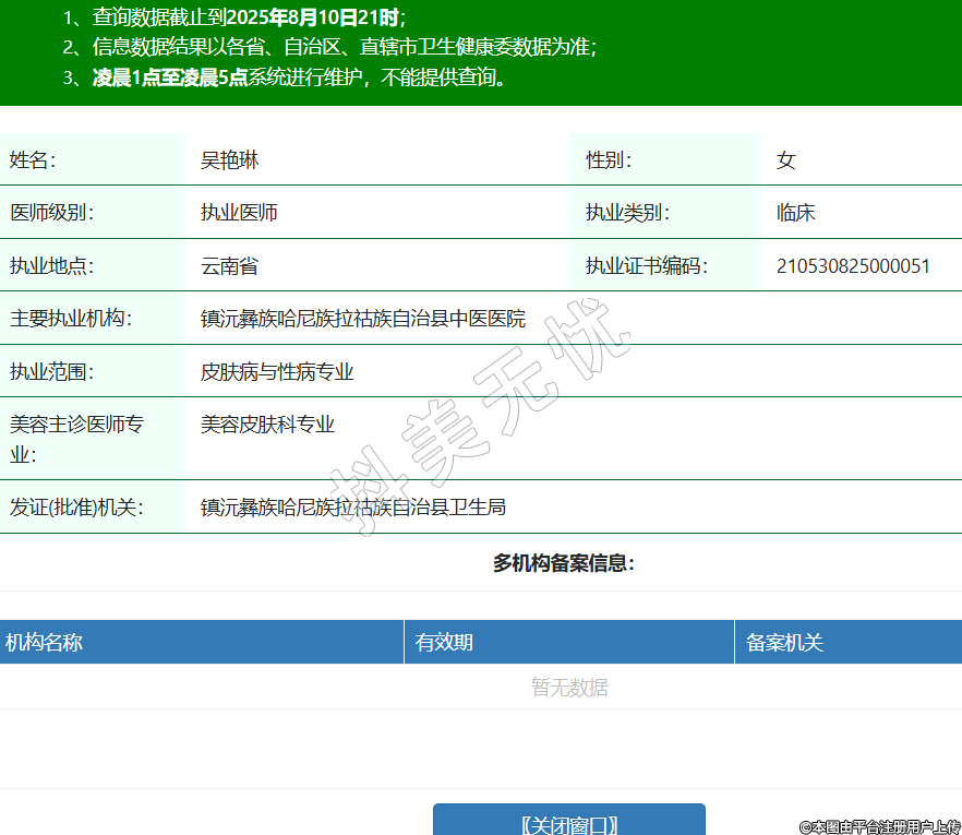 姓名:吳艷琳性別:女醫(yī)師級別:執(zhí)業(yè)醫(yī)師執(zhí)業(yè)類別:臨床執(zhí)業(yè)地點:云南省執(zhí)業(yè)證書編碼:210530825000051主要執(zhí)業(yè)機構(gòu):鎮(zhèn)沅彝族哈尼族拉祜族自治縣中醫(yī)醫(yī)院執(zhí)業(yè)范圍:皮膚病與性病專業(yè)美容主診醫(yī)師專業(yè):美容皮膚科專業(yè)發(fā)證(批準(zhǔn))機關(guān):鎮(zhèn)沅彝族哈尼族拉祜族自治縣衛(wèi)生局