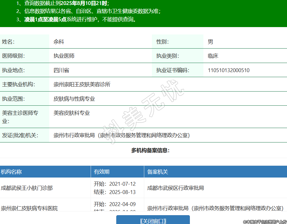 姓名:余科性別:男醫(yī)師級別:執(zhí)業(yè)醫(yī)師執(zhí)業(yè)類別:臨床執(zhí)業(yè)地點:四川省執(zhí)業(yè)證書編碼:110510132000510主要執(zhí)業(yè)機構:崇州崇陽王皮膚美容診所執(zhí)業(yè)范圍:皮膚病與性病專業(yè)美容主診醫(yī)師專業(yè):美容皮膚科專業(yè)發(fā)證(批準)機關:崇州市行政審批局(崇州市政務服務管理和網(wǎng)絡理政辦公室)多機構備案信息:機構名稱 有效期 備案機關 成都武侯王小膚門診部 開始:2021-07-12結束:2025-08-13成都市武侯區(qū)行政審批局 崇州崇仁皮膚病??漆t(yī)院 開始:2022-04-09結束:2026-04-08崇州市行政審批局(崇州市政務服務管理和網(wǎng)絡理政辦公室) 崇州謝雪冰皮膚診所 開始:2023-10-21結束:2026-10-20崇州市行政審批局(崇州市政務服務管理和網(wǎng)絡理政辦公室) 崇州崇仁醫(yī)院 開始:2024-02-01結束:2029-01-30崇州市行政審批局(崇州市政務服務管理和網(wǎng)絡理政辦公室) 崇州崇陽漢密爾頓醫(yī)學美容門診部 開始:2025-06-10結束:2026-06-09崇州市行政審批局(崇州市政務服務管理和網(wǎng)絡理政辦公室) -
