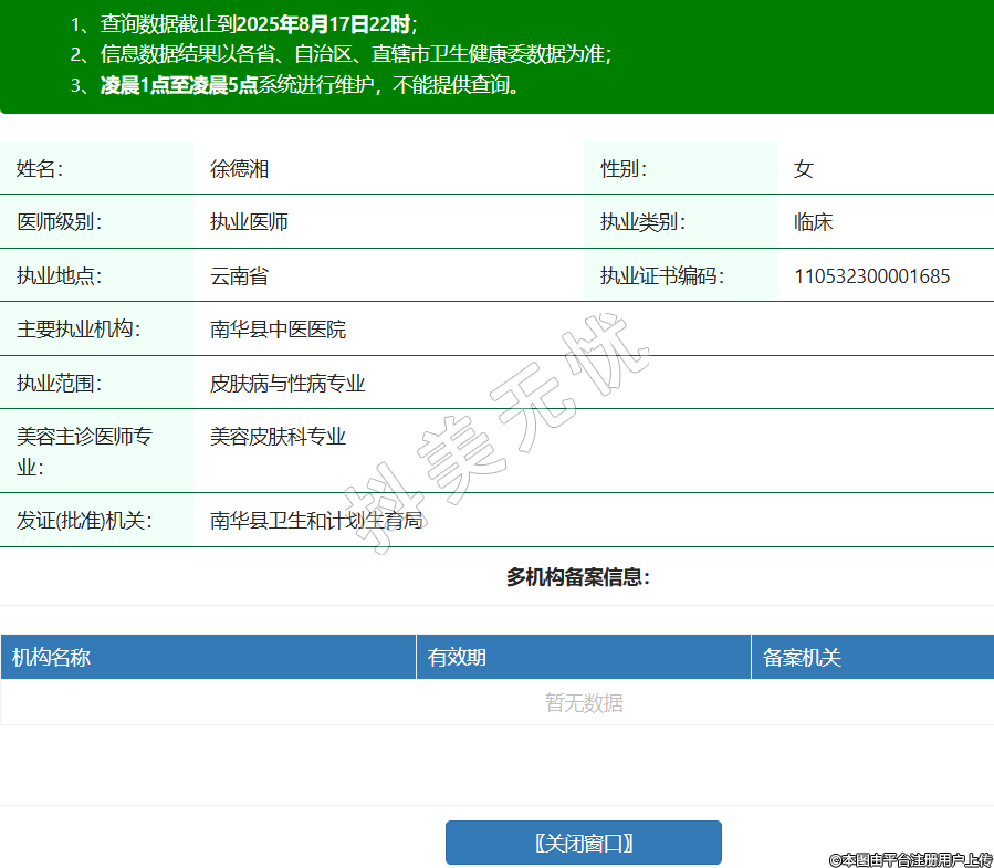 姓名:徐德湘性別:女醫(yī)師級別:執(zhí)業(yè)醫(yī)師執(zhí)業(yè)類別:臨床執(zhí)業(yè)地點:云南省執(zhí)業(yè)證書編碼:110532300001685主要執(zhí)業(yè)機構(gòu):南華縣中醫(yī)醫(yī)院執(zhí)業(yè)范圍:皮膚病與性病專業(yè)美容主診醫(yī)師專業(yè):美容皮膚科專業(yè)發(fā)證(批準)機關(guān):南華縣衛(wèi)生和計劃生育局 -