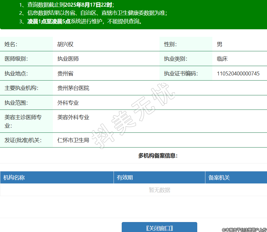 姓名:胡興權(quán)性別:男醫(yī)師級(jí)別:執(zhí)業(yè)醫(yī)師執(zhí)業(yè)類別:臨床執(zhí)業(yè)地點(diǎn):貴州省執(zhí)業(yè)證書(shū)編碼:110520400000745主要執(zhí)業(yè)機(jī)構(gòu):貴州茅臺(tái)醫(yī)院執(zhí)業(yè)范圍:外科專業(yè)美容主診醫(yī)師專業(yè):美容外科專業(yè)發(fā)證(批準(zhǔn))機(jī)關(guān):仁懷市衛(wèi)生局 -