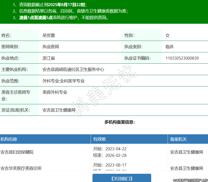 機(jī)構(gòu)名稱(chēng) 有效期 備案機(jī)關(guān) 安吉縣婦幼保健院 開(kāi)始:2023-04-22結(jié)束:2026-02-28安吉縣衛(wèi)生健康局 安吉華芙醫(yī)療美容診所 開(kāi)始:2023-08-17結(jié)束:2026-08-03安吉縣衛(wèi)生健康局 安吉新顏醫(yī)療美容診所 開(kāi)始:2024-11-28結(jié)束:2027-11-27安吉縣衛(wèi)生健康局 -