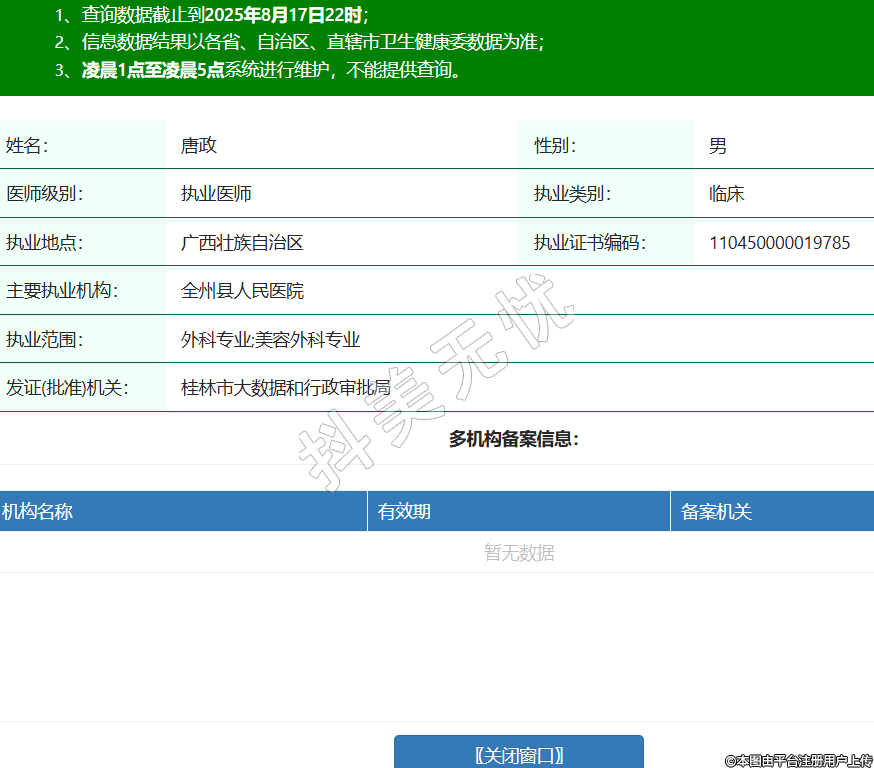 姓名:唐政性別:男醫(yī)師級(jí)別:執(zhí)業(yè)醫(yī)師執(zhí)業(yè)類別:臨床執(zhí)業(yè)地點(diǎn):廣西壯族自治區(qū)執(zhí)業(yè)證書(shū)編碼:110450000019785主要執(zhí)業(yè)機(jī)構(gòu):全州縣人民醫(yī)院執(zhí)業(yè)范圍:外科專業(yè);美容外科專業(yè)發(fā)證(批準(zhǔn))機(jī)關(guān):桂林市大數(shù)據(jù)和行政審批局 -