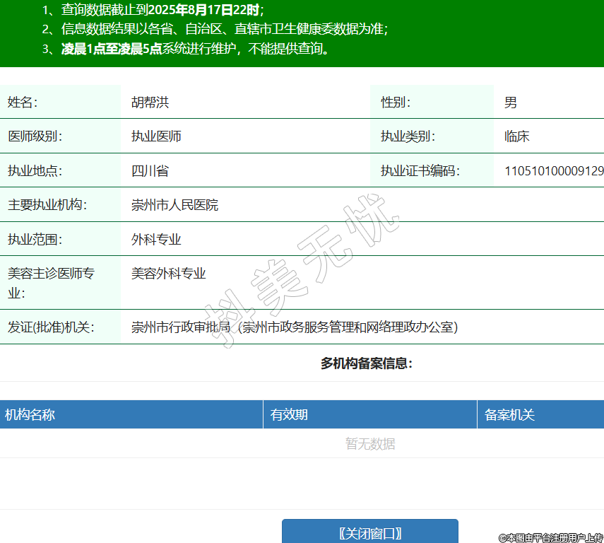 姓名:胡幫洪性別:男醫(yī)師級別:執(zhí)業(yè)醫(yī)師執(zhí)業(yè)類別:臨床執(zhí)業(yè)地點:四川省執(zhí)業(yè)證書編碼:110510100009129主要執(zhí)業(yè)機構(gòu):崇州市人民醫(yī)院執(zhí)業(yè)范圍:外科專業(yè)美容主診醫(yī)師專業(yè):美容外科專業(yè)發(fā)證(批準)機關(guān):崇州市行政審批局(崇州市政務服務管理和網(wǎng)絡理政辦公室) -