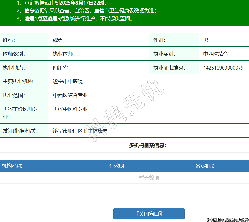 姓名:魏勇性別:男醫(yī)師級別:執(zhí)業(yè)醫(yī)師執(zhí)業(yè)類別:中西醫(yī)結(jié)合執(zhí)業(yè)地點:四川省執(zhí)業(yè)證書編碼:142510903000079主要執(zhí)業(yè)機構(gòu):遂寧市中醫(yī)院執(zhí)業(yè)范圍:中西醫(yī)結(jié)合專業(yè)美容主診醫(yī)師專業(yè):美容中醫(yī)科專業(yè)發(fā)證(批準)機關(guān):遂寧市船山區(qū)衛(wèi)生健康局