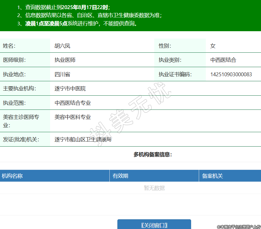 姓名:胡六鳳性別:女醫(yī)師級別:執(zhí)業(yè)醫(yī)師執(zhí)業(yè)類別:中西醫(yī)結(jié)合執(zhí)業(yè)地點:四川省執(zhí)業(yè)證書編碼:142510903000083主要執(zhí)業(yè)機構(gòu):遂寧市中醫(yī)院執(zhí)業(yè)范圍:中西醫(yī)結(jié)合專業(yè)美容主診醫(yī)師專業(yè):美容中醫(yī)科專業(yè)發(fā)證(批準(zhǔn))機關(guān):遂寧市船山區(qū)衛(wèi)生健康局