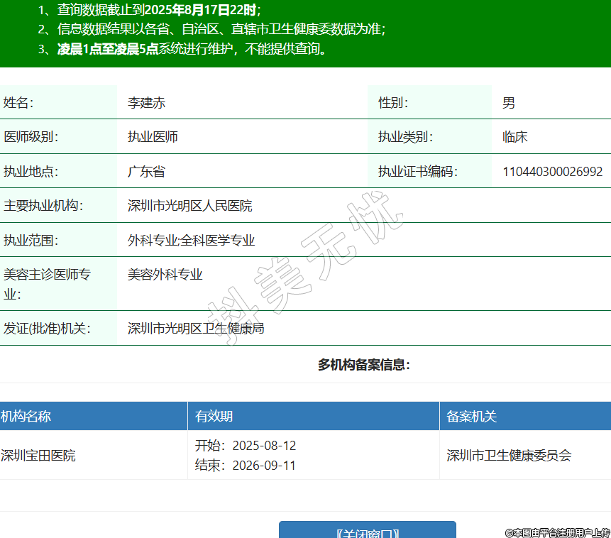 姓名:李建赤性別:男醫(yī)師級別:執(zhí)業(yè)醫(yī)師執(zhí)業(yè)類別:臨床執(zhí)業(yè)地點(diǎn):廣東省執(zhí)業(yè)證書編碼:110440300026992主要執(zhí)業(yè)機(jī)構(gòu):深圳市光明區(qū)人民醫(yī)院執(zhí)業(yè)范圍:外科專業(yè);全科醫(yī)學(xué)專業(yè)美容主診醫(yī)師專業(yè):美容外科專業(yè)發(fā)證(批準(zhǔn))機(jī)關(guān):深圳市光明區(qū)衛(wèi)生健康局多機(jī)構(gòu)備案信息: 姓名:李建赤性別:男醫(yī)師級別:執(zhí)業(yè)醫(yī)師執(zhí)業(yè)類別:臨床執(zhí)業(yè)地點(diǎn):廣東省執(zhí)業(yè)證書編碼:110440300026992主要執(zhí)業(yè)機(jī)構(gòu):深圳市光明區(qū)人民醫(yī)院執(zhí)業(yè)范圍:外科專業(yè);全科醫(yī)學(xué)專業(yè)美容主診醫(yī)師專業(yè):美容外科專業(yè)發(fā)證(批準(zhǔn))機(jī)關(guān):深圳市光明區(qū)衛(wèi)生健康局多機(jī)構(gòu)備案信息:機(jī)構(gòu)名稱 有效期 備案機(jī)關(guān) 深圳寶田醫(yī)院 開始:2025-08-12結(jié)束:2026-09-11深圳市衛(wèi)生健康委員會