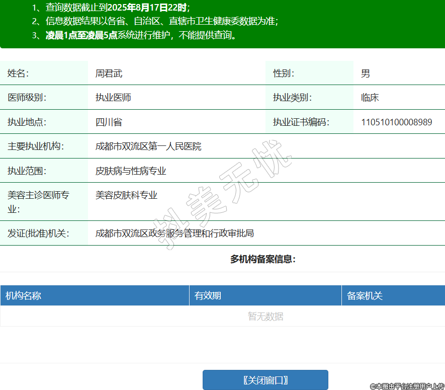 姓名:周君武性別:男醫(yī)師級別:執(zhí)業(yè)醫(yī)師執(zhí)業(yè)類別:臨床執(zhí)業(yè)地點:四川省執(zhí)業(yè)證書編碼:110510100008989主要執(zhí)業(yè)機構(gòu):成都市雙流區(qū)第一人民醫(yī)院執(zhí)業(yè)范圍:皮膚病與性病專業(yè)美容主診醫(yī)師專業(yè):美容皮膚科專業(yè)發(fā)證(批準)機關:成都市雙流區(qū)政務服務管理和行政審批局 -