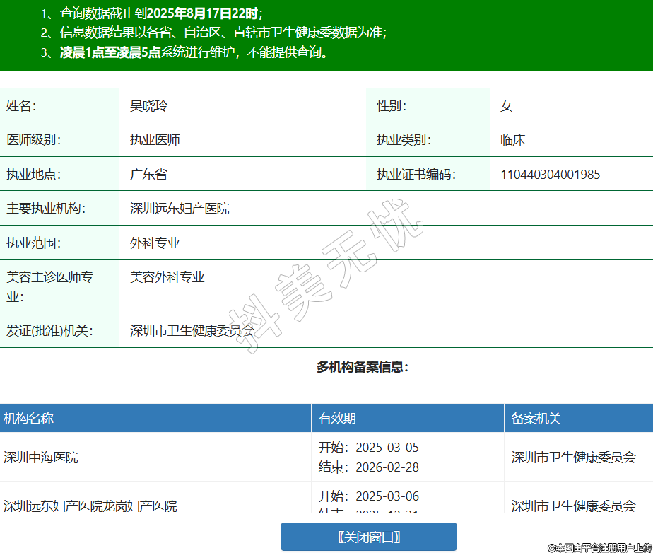 姓名:吳曉玲性別:女醫(yī)師級別:執(zhí)業(yè)醫(yī)師執(zhí)業(yè)類別:臨床執(zhí)業(yè)地點(diǎn):廣東省執(zhí)業(yè)證書編碼:110440304001985主要執(zhí)業(yè)機(jī)構(gòu):深圳遠(yuǎn)東婦產(chǎn)醫(yī)院執(zhí)業(yè)范圍:外科專業(yè)美容主診醫(yī)師專業(yè):美容外科專業(yè)發(fā)證(批準(zhǔn))機(jī)關(guān):深圳市衛(wèi)生健康委員會多機(jī)構(gòu)備案信息: 姓名:吳曉玲性別:女醫(yī)師級別:執(zhí)業(yè)醫(yī)師執(zhí)業(yè)類別:臨床執(zhí)業(yè)地點(diǎn):廣東省執(zhí)業(yè)證書編碼:110440304001985主要執(zhí)業(yè)機(jī)構(gòu):深圳遠(yuǎn)東婦產(chǎn)醫(yī)院執(zhí)業(yè)范圍:外科專業(yè)美容主診醫(yī)師專業(yè):美容外科專業(yè)發(fā)證(批準(zhǔn))機(jī)關(guān):深圳市衛(wèi)生健康委員會多機(jī)構(gòu)備案信息:機(jī)構(gòu)名稱 有效期 備案機(jī)關(guān) 深圳中海醫(yī)院 開始:2025-03-05結(jié)束:2026-02-28深圳市衛(wèi)生健康委員會 深圳遠(yuǎn)東婦產(chǎn)醫(yī)院龍崗婦產(chǎn)醫(yī)院 開始:2025-03-06結(jié)束:2025-12-31深圳市衛(wèi)生健康委員會