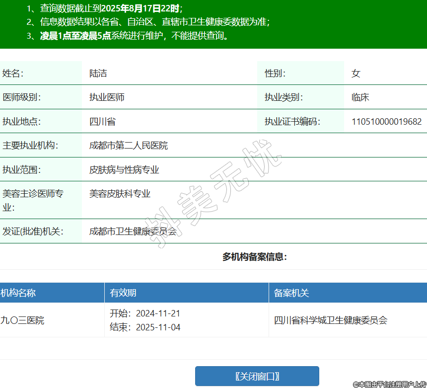 姓名:陸潔性別:女醫(yī)師級別:執(zhí)業(yè)醫(yī)師執(zhí)業(yè)類別:臨床執(zhí)業(yè)地點:四川省執(zhí)業(yè)證書編碼:110510000019682主要執(zhí)業(yè)機構(gòu):成都市第二人民醫(yī)院執(zhí)業(yè)范圍:皮膚病與性病專業(yè)美容主診醫(yī)師專業(yè):美容皮膚科專業(yè)發(fā)證(批準)機關(guān):成都市衛(wèi)生健康委員會多機構(gòu)備案信息: 姓名:陸潔性別:女醫(yī)師級別:執(zhí)業(yè)醫(yī)師執(zhí)業(yè)類別:臨床執(zhí)業(yè)地點:四川省執(zhí)業(yè)證書編碼:110510000019682主要執(zhí)業(yè)機構(gòu):成都市第二人民醫(yī)院執(zhí)業(yè)范圍:皮膚病與性病專業(yè)美容主診醫(yī)師專業(yè):美容皮膚科專業(yè)發(fā)證(批準)機關(guān):成都市衛(wèi)生健康委員會多機構(gòu)備案信息:機構(gòu)名稱 有效期 備案機關(guān) 九〇三醫(yī)院 開始:2024-11-21結(jié)束:2025-11-04四川省科學城衛(wèi)生健康委員會