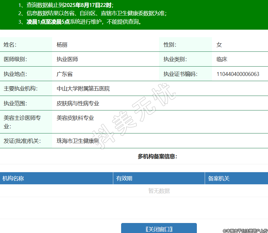 姓名:楊麗性別:女醫(yī)師級(jí)別:執(zhí)業(yè)醫(yī)師執(zhí)業(yè)類別:臨床執(zhí)業(yè)地點(diǎn):廣東省執(zhí)業(yè)證書(shū)編碼:110440400006063主要執(zhí)業(yè)機(jī)構(gòu):中山大學(xué)附屬第五醫(yī)院執(zhí)業(yè)范圍:皮膚病與性病專業(yè)美容主診醫(yī)師專業(yè):美容皮膚科專業(yè)發(fā)證(批準(zhǔn))機(jī)關(guān):珠海市衛(wèi)生健康局 -
