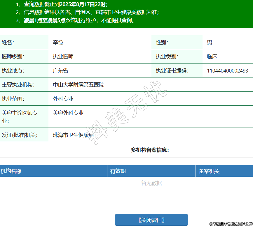 姓名:辛儉性別:男醫(yī)師級別:執(zhí)業(yè)醫(yī)師執(zhí)業(yè)類別:臨床執(zhí)業(yè)地點:廣東省執(zhí)業(yè)證書編碼:110440400002493主要執(zhí)業(yè)機構:中山大學附屬第五醫(yī)院執(zhí)業(yè)范圍:外科專業(yè)美容主診醫(yī)師專業(yè):美容外科專業(yè)發(fā)證(批準)機關:珠海市衛(wèi)生健康局 -