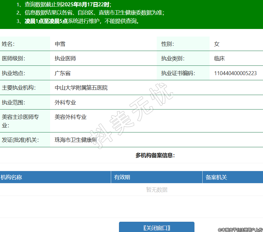 姓名:申雪性別:女醫(yī)師級別:執(zhí)業(yè)醫(yī)師執(zhí)業(yè)類別:臨床執(zhí)業(yè)地點:廣東省執(zhí)業(yè)證書編碼:110440400005223主要執(zhí)業(yè)機(jī)構(gòu):中山大學(xué)附屬第五醫(yī)院執(zhí)業(yè)范圍:外科專業(yè)美容主診醫(yī)師專業(yè):美容外科專業(yè)發(fā)證(批準(zhǔn))機(jī)關(guān):珠海市衛(wèi)生健康局 -