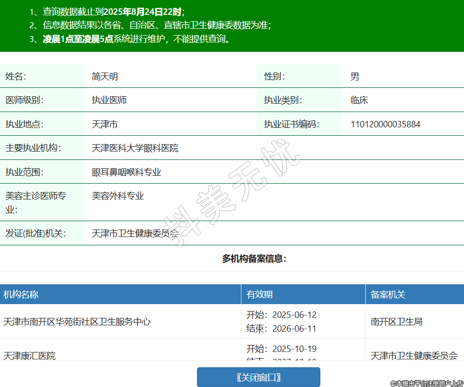姓名:簡天明性別:男醫(yī)師級別:執(zhí)業(yè)醫(yī)師執(zhí)業(yè)類別:臨床執(zhí)業(yè)地點(diǎn):天津市執(zhí)業(yè)證書編碼:110120000035884主要執(zhí)業(yè)機(jī)構(gòu):天津醫(yī)科大學(xué)眼科醫(yī)院執(zhí)業(yè)范圍:眼耳鼻咽喉科專業(yè)美容主診醫(yī)師專業(yè):美容外科專業(yè)發(fā)證(批準(zhǔn))機(jī)關(guān):天津市衛(wèi)生健康委員會(huì)多機(jī)構(gòu)備案信息:機(jī)構(gòu)名稱 有效期 備案機(jī)關(guān) 天津市南開區(qū)華苑街社區(qū)衛(wèi)生服務(wù)中心 開始:2025-06-12結(jié)束:2026-06-11南開區(qū)衛(wèi)生局 天津康匯醫(yī)院 開始:2025-10-19結(jié)束:2027-10-18天津市衛(wèi)生健康委員會(huì) -