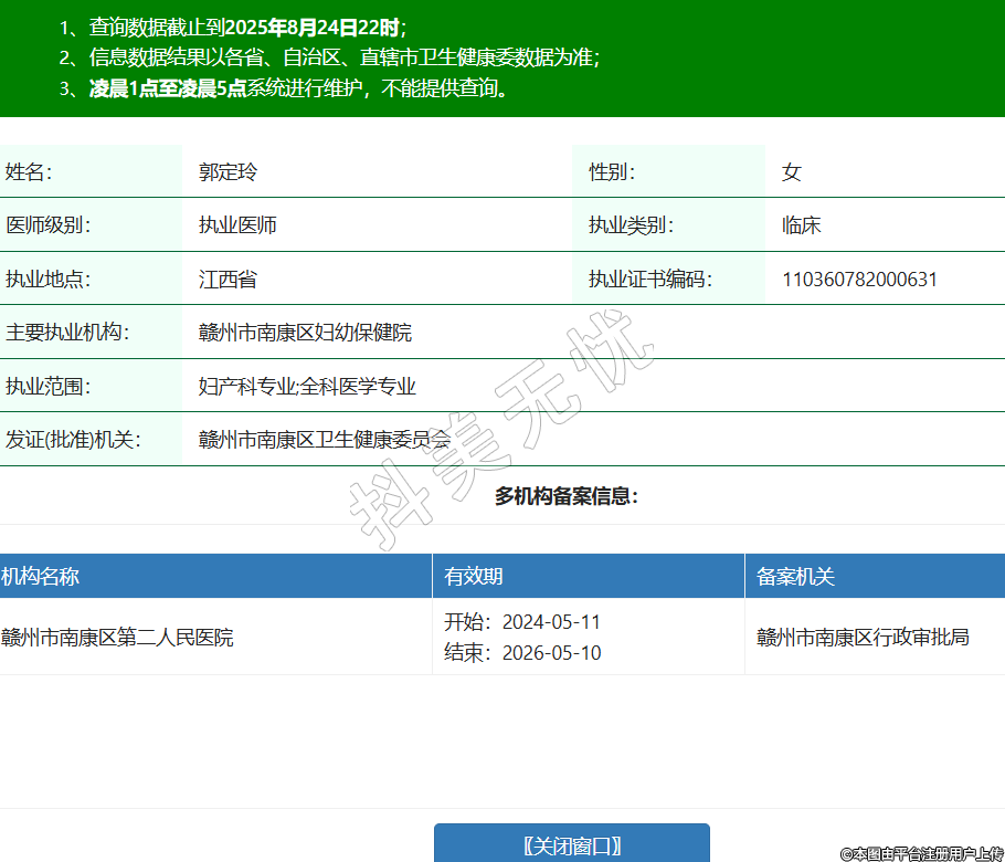 姓名:郭定玲性別:女醫(yī)師級別:執(zhí)業(yè)醫(yī)師執(zhí)業(yè)類別:臨床執(zhí)業(yè)地點:江西省執(zhí)業(yè)證書編碼:110360782000631主要執(zhí)業(yè)機構:贛州市南康區(qū)婦幼保健院執(zhí)業(yè)范圍:婦產科專業(yè);全科醫(yī)學專業(yè)發(fā)證(批準)機關:贛州市南康區(qū)衛(wèi)生健康委員會多機構備案信息:機構名稱 有效期 備案機關 贛州市南康區(qū)第二人民醫(yī)院 開始:2024-05-11結束:2026-05-10贛州市南康區(qū)行政審批局 -