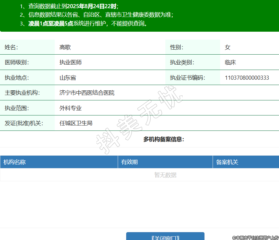 姓名:高歌性別:女醫(yī)師級別:執(zhí)業(yè)醫(yī)師執(zhí)業(yè)類別:臨床執(zhí)業(yè)地點(diǎn):山東省執(zhí)業(yè)證書編碼:110370800000333主要執(zhí)業(yè)機(jī)構(gòu):濟(jì)寧市中西醫(yī)結(jié)合醫(yī)院執(zhí)業(yè)范圍:外科專業(yè)發(fā)證(批準(zhǔn))機(jī)關(guān):任城區(qū)衛(wèi)生局 -