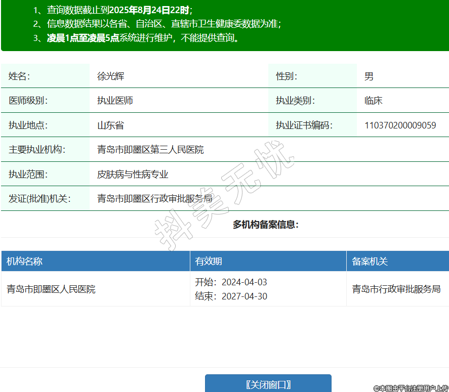 姓名:徐光輝性別:男醫(yī)師級別:執(zhí)業(yè)醫(yī)師執(zhí)業(yè)類別:臨床執(zhí)業(yè)地點:山東省執(zhí)業(yè)證書編碼:110370200009059主要執(zhí)業(yè)機構(gòu):青島市即墨區(qū)第三人民醫(yī)院執(zhí)業(yè)范圍:皮膚病與性病專業(yè)發(fā)證(批準(zhǔn))機關(guān):青島市即墨區(qū)行政審批服務(wù)局多機構(gòu)備案信息:機構(gòu)名稱 有效期 備案機關(guān) 青島市即墨區(qū)人民醫(yī)院 開始:2024-04-03結(jié)束:2027-04-30青島市行政審批服務(wù)局 -