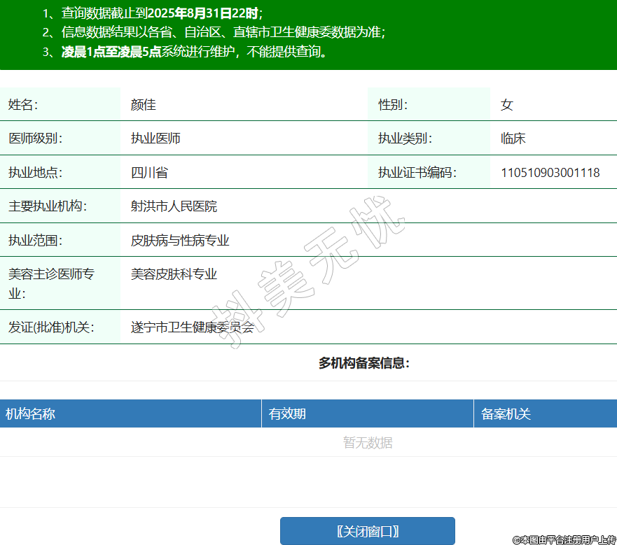 姓名:顏佳性別:女醫(yī)師級別:執(zhí)業(yè)醫(yī)師執(zhí)業(yè)類別:臨床執(zhí)業(yè)地點:四川省執(zhí)業(yè)證書編碼:110510903001118主要執(zhí)業(yè)機構:射洪市人民醫(yī)院執(zhí)業(yè)范圍:皮膚病與性病專業(yè)美容主診醫(yī)師專業(yè):美容皮膚科專業(yè)發(fā)證(批準)機關:遂寧市衛(wèi)生健康委員會