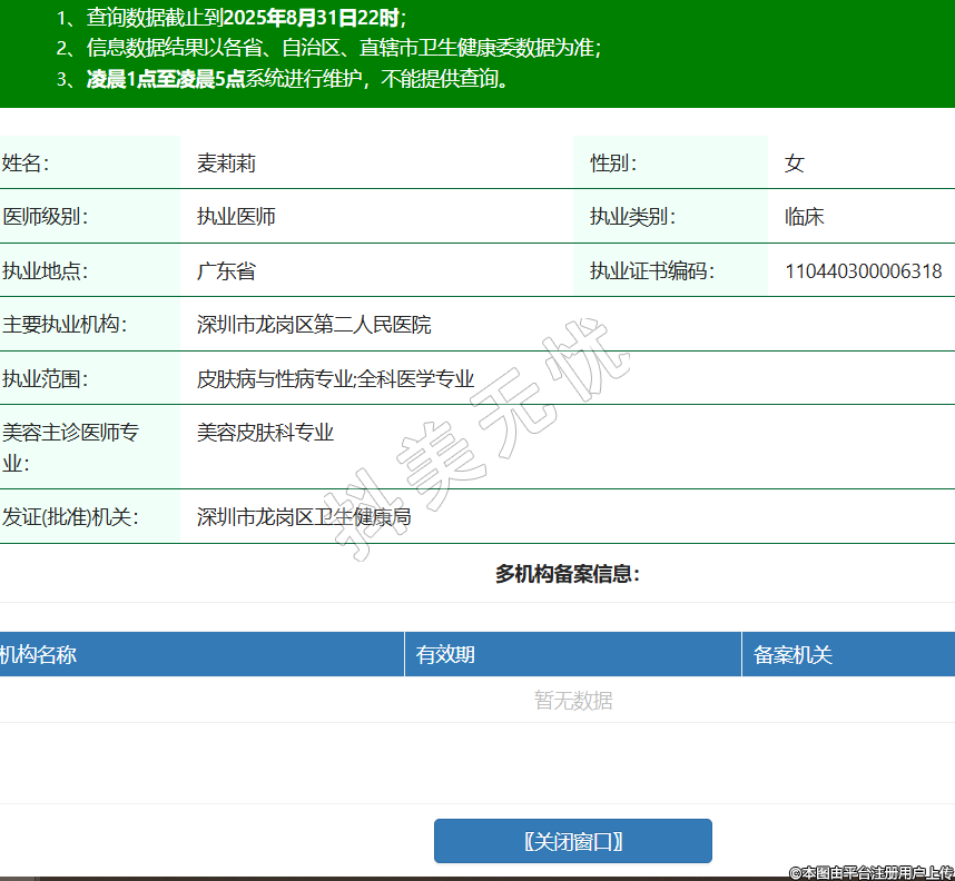 姓名:麥莉莉性別:女醫(yī)師級(jí)別:執(zhí)業(yè)醫(yī)師執(zhí)業(yè)類別:臨床執(zhí)業(yè)地點(diǎn):廣東省執(zhí)業(yè)證書編碼:110440300006318主要執(zhí)業(yè)機(jī)構(gòu):深圳市龍崗區(qū)第二人民醫(yī)院執(zhí)業(yè)范圍:皮膚病與性病專業(yè);全科醫(yī)學(xué)專業(yè)美容主診醫(yī)師專業(yè):美容皮膚科專業(yè)發(fā)證(批準(zhǔn))機(jī)關(guān):深圳市龍崗區(qū)衛(wèi)生健康局 -