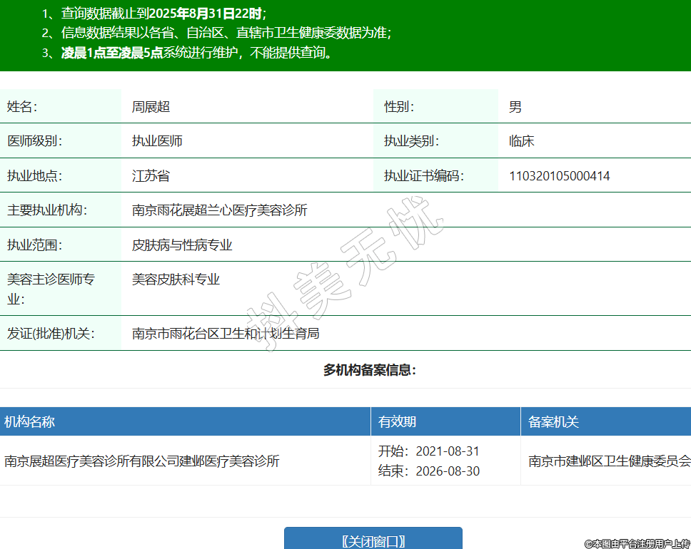 姓名:周展超性別:男醫(yī)師級(jí)別:執(zhí)業(yè)醫(yī)師執(zhí)業(yè)類(lèi)別:臨床執(zhí)業(yè)地點(diǎn):江蘇省執(zhí)業(yè)證書(shū)編碼:110320105000414主要執(zhí)業(yè)機(jī)構(gòu):南京雨花展超蘭心醫(yī)療美容診所執(zhí)業(yè)范圍:皮膚病與性病專(zhuān)業(yè)美容主診醫(yī)師專(zhuān)業(yè):美容皮膚科專(zhuān)業(yè)發(fā)證(批準(zhǔn))機(jī)關(guān):南京市雨花臺(tái)區(qū)衛(wèi)生和計(jì)劃生育局多機(jī)構(gòu)備案信息:機(jī)構(gòu)名稱(chēng) 有效期 備案機(jī)關(guān) 南京展超醫(yī)療美容診所有限公司建鄴醫(yī)療美容診所 開(kāi)始:2021-08-31結(jié)束:2026-08-30南京市建鄴區(qū)衛(wèi)生健康委員會(huì) -