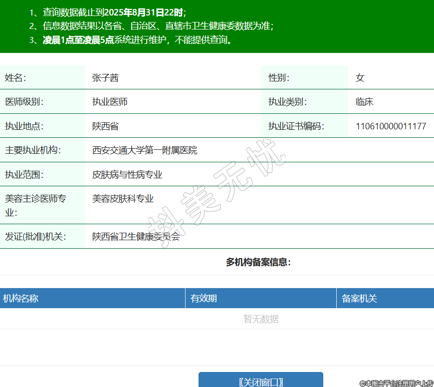 姓名:張子茜性別:女醫(yī)師級(jí)別:執(zhí)業(yè)醫(yī)師執(zhí)業(yè)類別:臨床執(zhí)業(yè)地點(diǎn):陜西省執(zhí)業(yè)證書編碼:110610000011177主要執(zhí)業(yè)機(jī)構(gòu):西安交通大學(xué)第一附屬醫(yī)院執(zhí)業(yè)范圍:皮膚病與性病專業(yè)美容主診醫(yī)師專業(yè):美容皮膚科專業(yè)發(fā)證(批準(zhǔn))機(jī)關(guān):陜西省衛(wèi)生健康委員會(huì) -